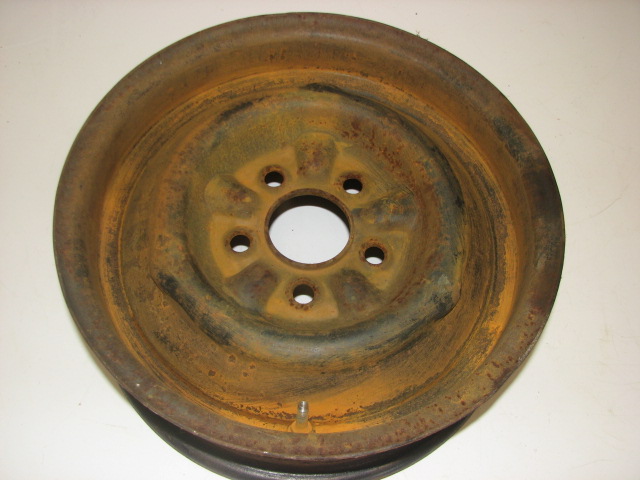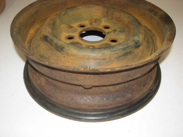 Steel wheel with 2-9/16" center hole and .50" offset rated at 1870#. 5 lug holes on 4-1/2" bolt circle. Has surface rust, but can be cleaned up and painted.