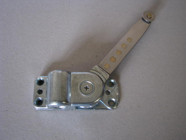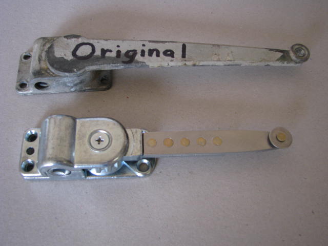 This is a retro-fit window crank. It is not exactly like the original one but is the best we could come up with. This crank only allows the window to be opened approximately half way but this is still plenty to let fresh air in. You can normally use the same hole in your wood frame for the crank handle to go through but you have to add new holes for the crank to mount in the aluminum window jamb. The channel which is screwed to the window frame, which the roller slides into, must be slighted modified. (see photos) About 1" of this channel needs to be ground down approx. 1/8" so that it will clear the window crank when the window is tightly closed. The tolerences are real tight, so putting spacers/washers under the crank mechanism may need to be done for the crank out arm to clear everything.