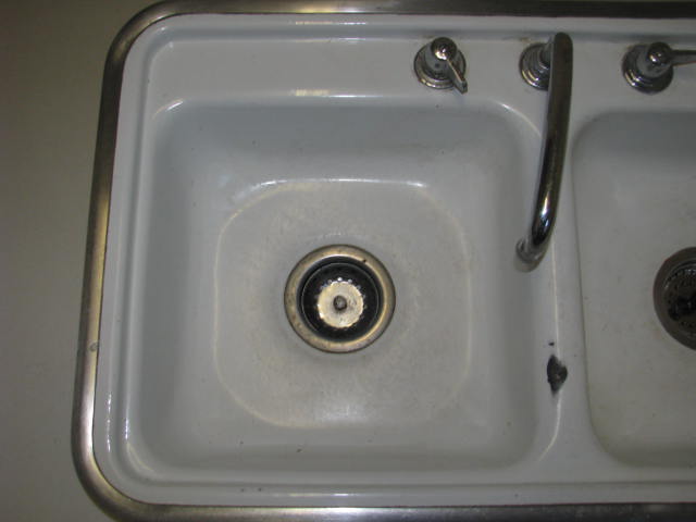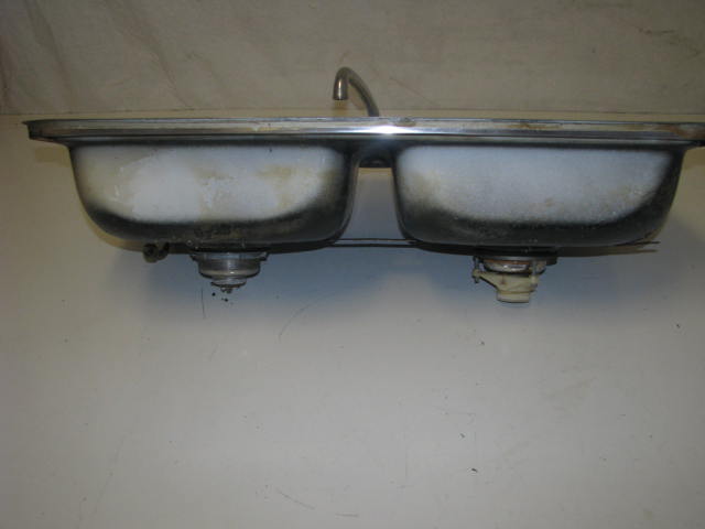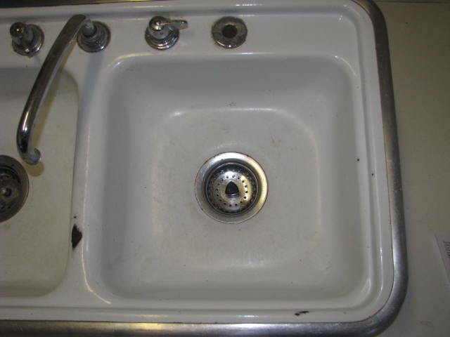 This sink has a rough opening of 32-1/4"x18-1/4". Has a few small chips and 1 larger chip in porcelain. Faucet has some minor pitting in it. There is a spot for a hand sprayer, but the spayer is missiing. Faucet seals may need to be changed. Mounting clips are included.