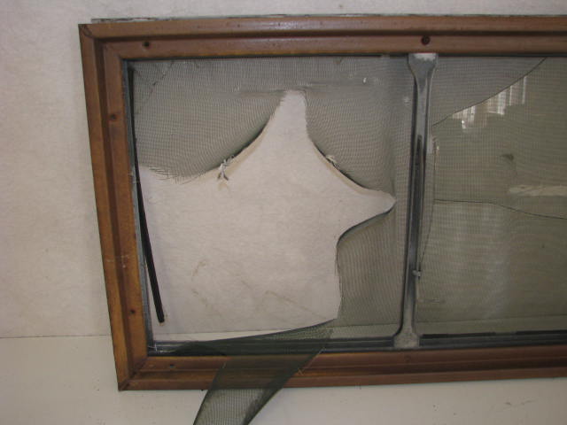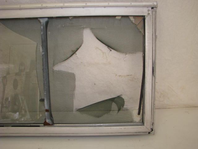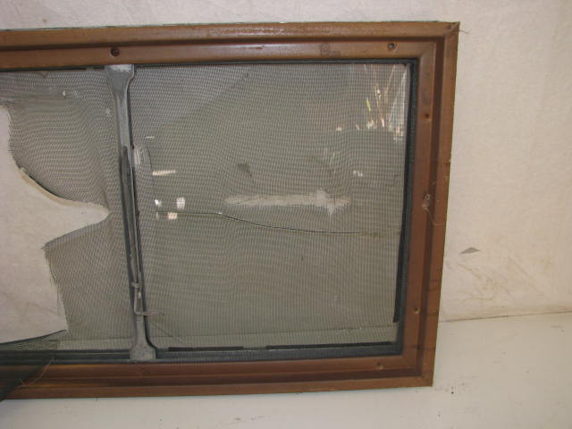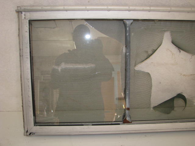 This window has a 30-1/4"x17-7/8" rough opening. The window frame is aluminum that has been painted. The interior frame and hardware is steel. The screen is torn and glass is broken. Needs new seal and a few screw for mounting interior trim.