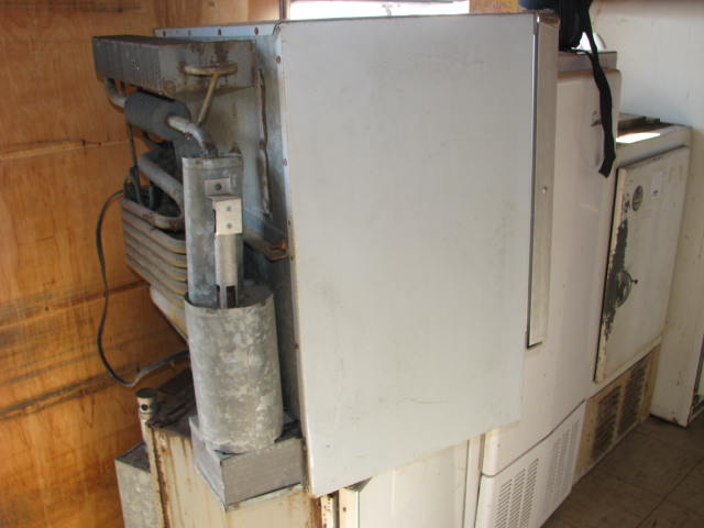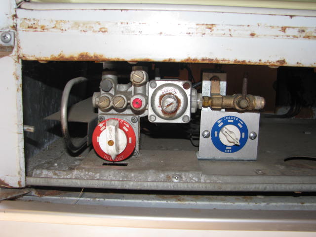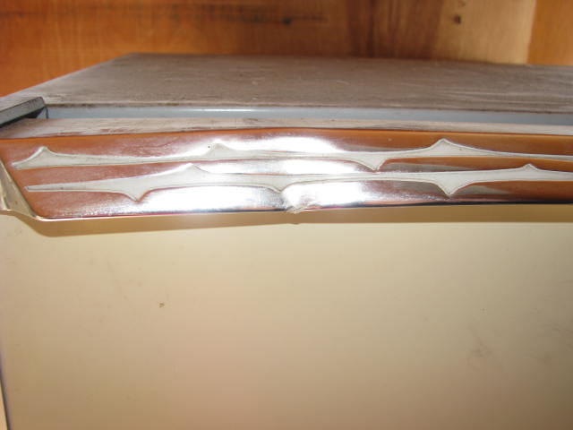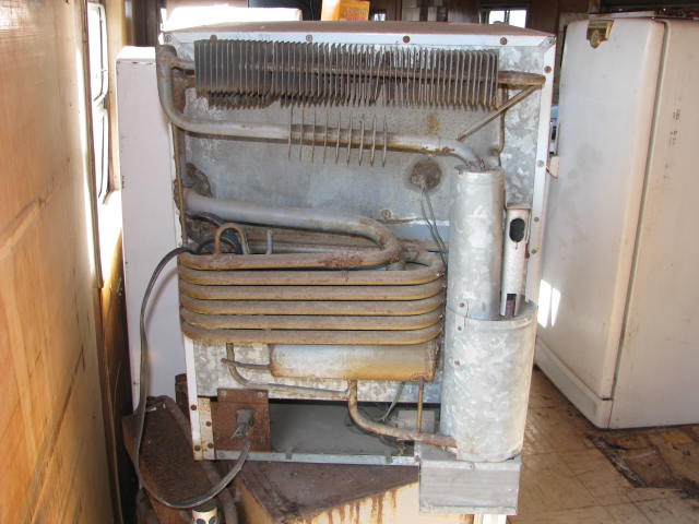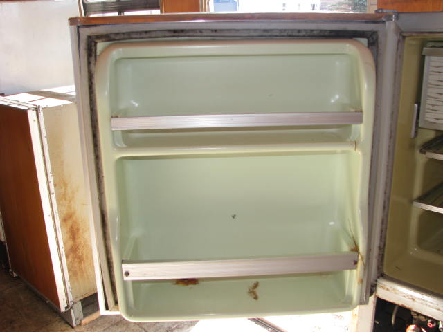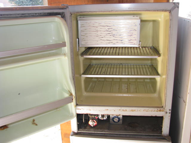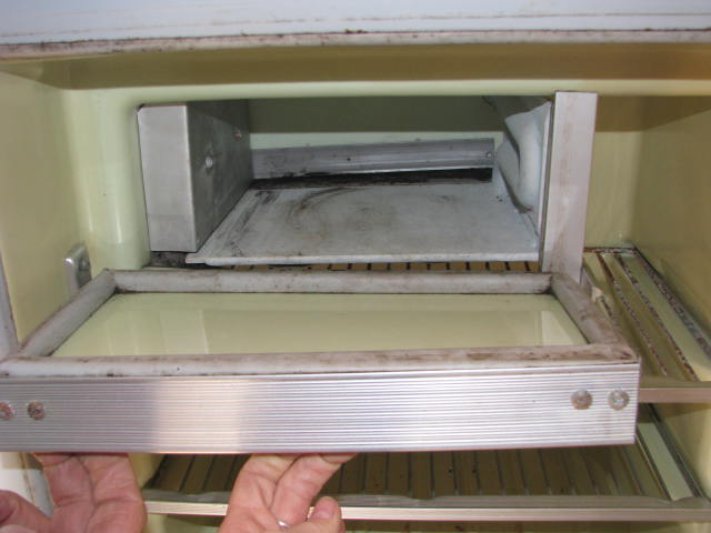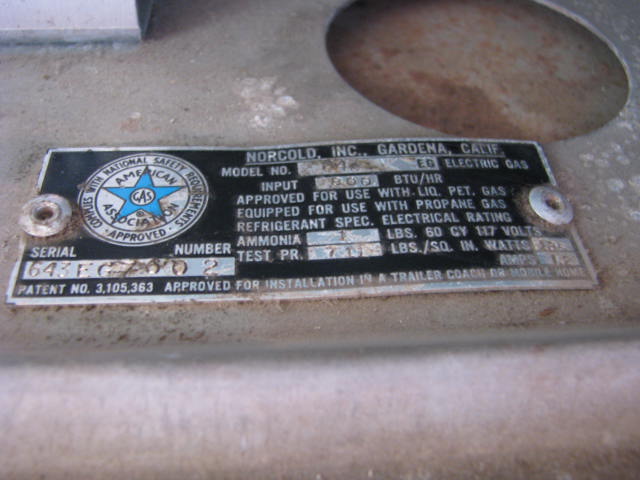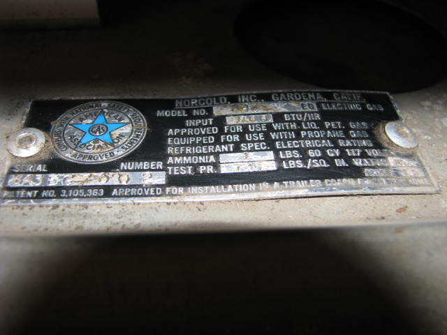 This Norcold Refrigerator is electric or gas. Model number is 643 EG. Tested at 0° Top and 20° Bottom at 50° ambient temperature. This is an unrestored appliance should be checked by a qualified technician before use. Has several cracks in the door liner and a small hairline crack in the mainliner. It is missing the botom control panel cover which could easily be made from sheet metal.