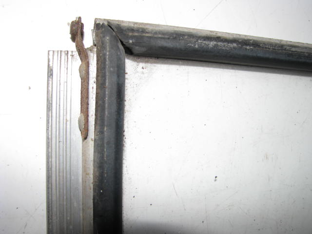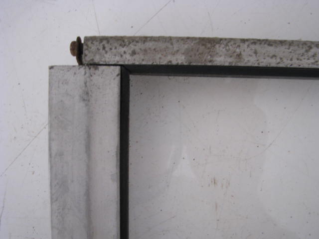 Aluminum frame with steel window bracket. Steel bracket has surface rust. Has both spring clips at top of window to keep window in frame at top. Top channel may be radiused or square cornered. Seals are old and there is no cracked, chipped or missing glass. May vary from photos but are in comparable condition.