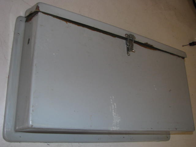 DescriptionBattery box is in good shape. May have some small cracks around the mounting holes. The gray coating is chipped in a couple spots on the lid. The lid has 4- 1/8" holes. The inside dimensions are 21-1/4 W x 4-1/2"D x 11" T.