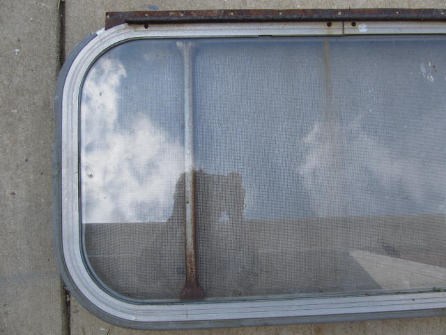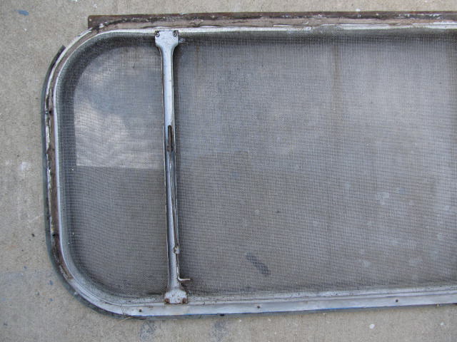 17-3/8” x 33-3/8” rough opening aluminum window. Frame is in good condition. The is no glass in this window. It has original screen and seals which may need replaced. It has two steel arms that are used to open the window. The window hinges, brace bars and arms have some surface rust, but are still solid. It comes with the interior garnish that is not in the photo. The interior garnish is in decent shape but is a little bent up due to being flimsy and has some minor surface rust/stains. Overall measurement of window is 19" x 34-1/2". Windows may vary from photos but are in comparable condition. This window does not have glass.