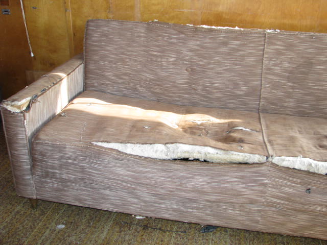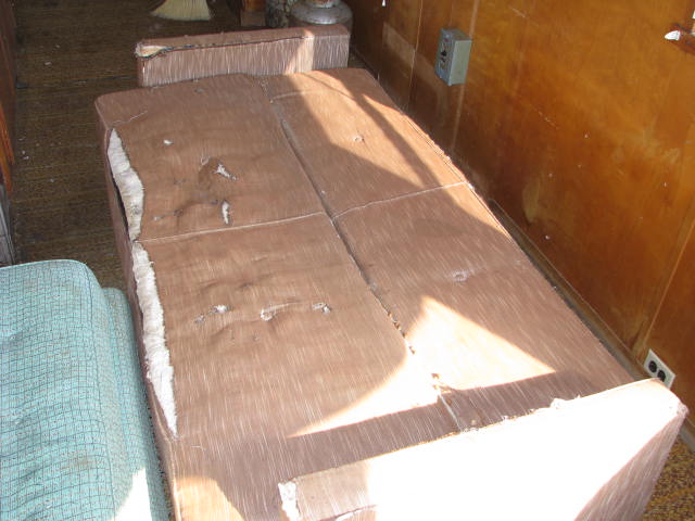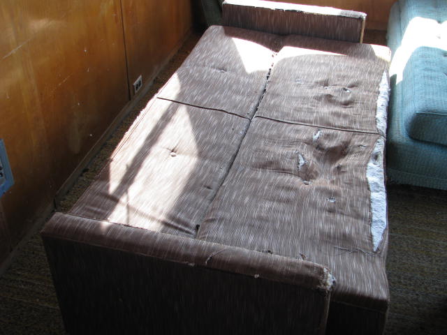This sofa folds up and down fine but will need re-upholstered. It folds into a 73" x 40" bed.