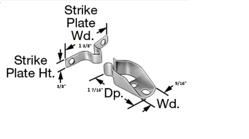 Grab Latch used for cabinet doors. Measurements for catch: 1 7/16"L x 9/16" W with a 1/2" projection. Mount holes center to center 7/16". Strike Plate measurements: 1 3/8"W x 3/8"H. Mount holes center to center 7/8". This has a 4lb. maximum pull strength, also uses #6 mounting screws *mouting hardware included*