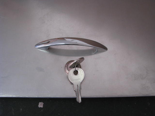 New reproduction built by same construction method as original compartment doors. Includes 2 keys to the lock and compartment handle. Compartment inside cam latch may require some modifications (ie. shortened) for some trailers. Requires opening dimensions of approx. 38-1/4" wide x 12-1/2" high. Does not have nutserts for license plate installation. Aluminum will have minor scratches from handling, but can be polished to a mirror-like shine. Original doors like this are extremely hard to find and are normally in very poor condition when found. (Will require installation of a new foam gasket, available at most hardware stores.) (These are custom made and may have a delay of 2-3 weeks if not instock.)