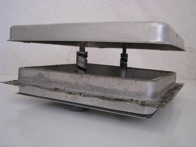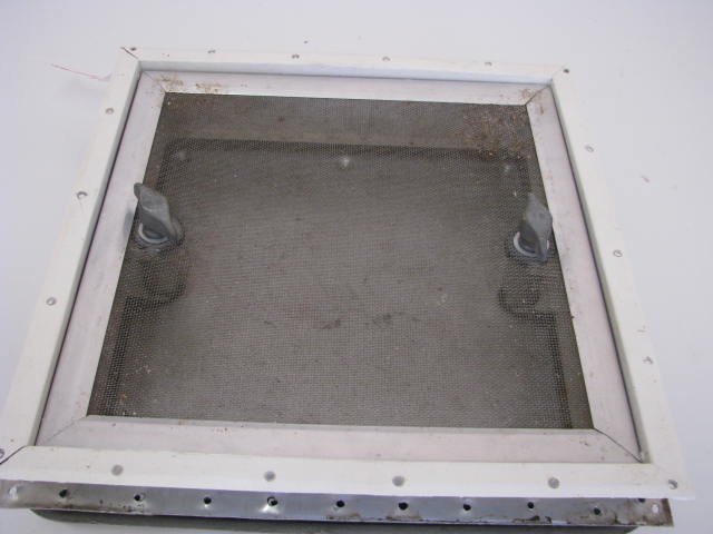 Original Hehr complete roof vent with interior garnish, screen and vent operators. Fits a 14" x 14" rough opening. All aluminum with no major defects. Both vent operators are in working condition and include both handles.